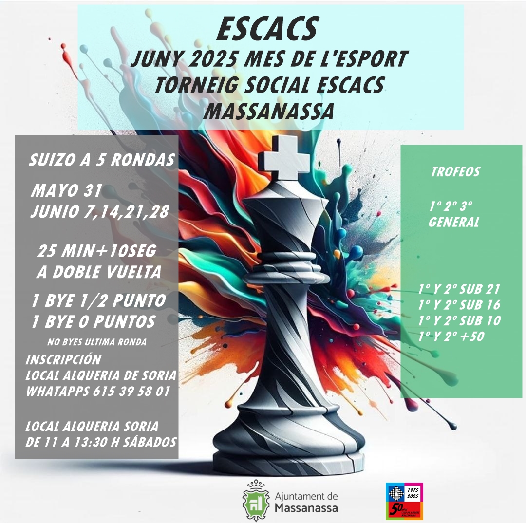 El dia 31 de mayo comenzó el torneo tradicional social del club de ajedrez Massanassa con la participación de 35 jugadores entre 8 a 65 años, emparejados con el sistema suizo.