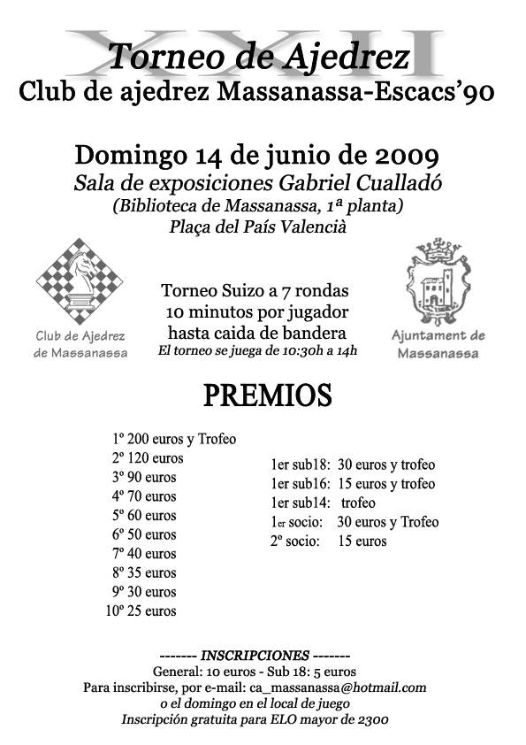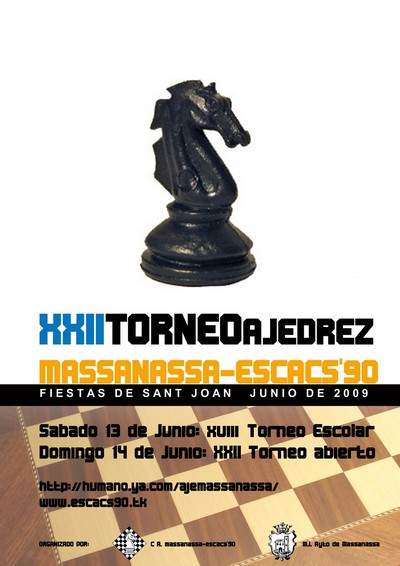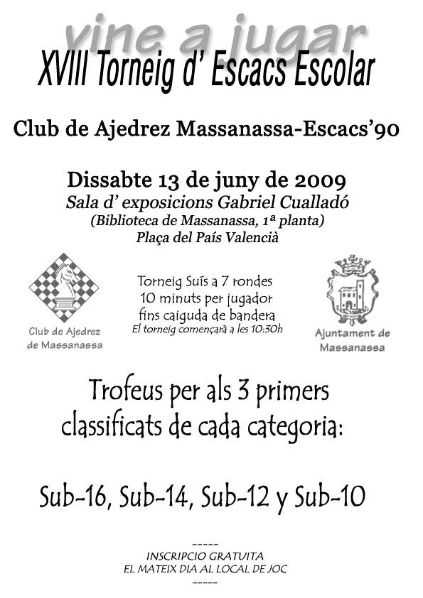 COMUNICAMOS QUE EL PÓXIMO SABADO 31 DE OCTUBRE COMENZAMOS EL TALLER DE AJEDREZ EN EL LOCAL DEL CLUB SITUADO EN LA AVENIDA DE GERMANÍES Nº8 DE MASSANASSA. LOS MONITORES: DAVID MARTÍN Y PEDRO CASADO ESTÁN A VUESTRA DISPOSICIÓN YA SEA PARA JUGAR PARTIDAS O PARA PEDIRLES QUE OS ENSEÑEN ALGÚN TEMA TÁTICO,ESTRATÉGICO, APERTURAS, FINALES ETC. Este taller de ajedrez va dirigido a todas las edades y niveles. Si te gusta el ajedrez no dudes que aquí podrás jugar buenas partidas y tendrás a tu disposición a los monitores y el material didáctico necesario. Saludos.